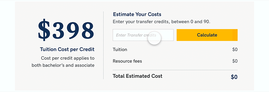 As shown in the user flow above, having a user go to another site (CollegeSource) and search their college, find their classes, and export them to an excel spread sheet was too involved. Even worse, the excel spread sheet didn’t actually provide a cost. With the new user flow, we reduced the number of steps, simplifying the experience to using a calculator to find out your estimated tuition.